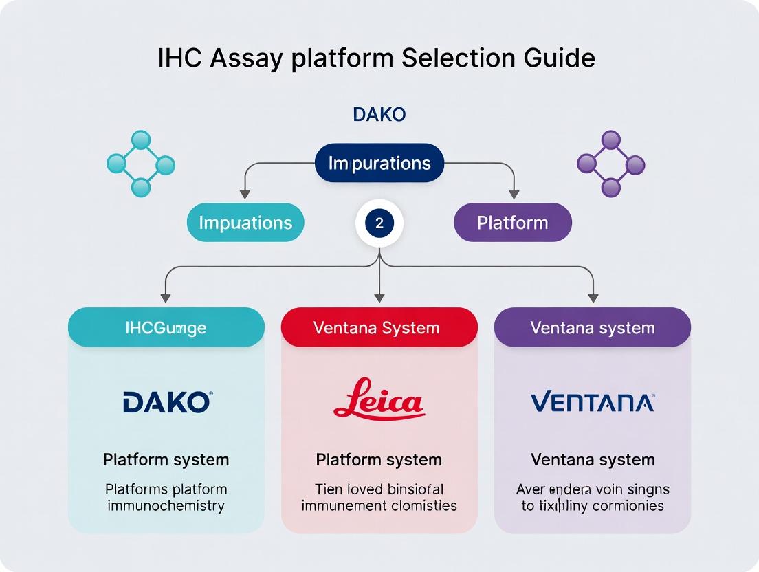 This comprehensive guide provides researchers, scientists, and drug development professionals with a critical analysis for selecting an immunohistochemistry (IHC) assay platform. We explore the foundational technologies of Dako (Agilent), Leica Biosystems, and Roche Ventana, covering methodological workflows, optimization strategies for specific biomarkers, advanced troubleshooting, and data validation. The article offers a comparative framework to align platform capabilities with research intents—from exploratory discovery to clinical trial support—enabling informed, strategic investment in IHC infrastructure.