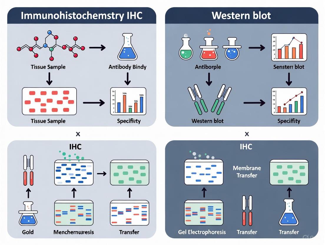 IHC and Western blot, while sharing the fundamental principle of antibody-antigen specificity, serve complementary roles in protein detection and analysis. IHC excels in providing spatial context within tissues, making it indispensable for diagnostic pathology and morphological correlation. Western blot offers superior capabilities for protein size determination and semi-quantitative analysis of expression levels. The choice between these techniques should be guided by the specific research question, with many studies benefiting from employing both methods to obtain comprehensive protein characterization. As antibody validation remains a critical concern for both techniques, rigorous controls and verification of specificity are essential for generating reliable, reproducible data in both research and diagnostic applications.