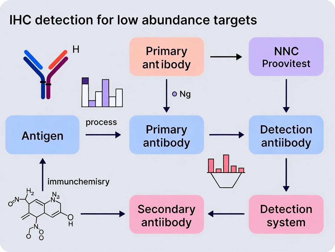 This comprehensive guide provides researchers, scientists, and drug development professionals with a strategic framework for successfully detecting low-abundance targets via immunohistochemistry (IHC). The article progresses from foundational principles defining low-abundance challenges to advanced methodological workflows, including tyramide signal amplification (TSA) and other amplification techniques. It offers systematic troubleshooting and optimization protocols to overcome sensitivity limits, background noise, and antigen masking. Finally, it details rigorous validation approaches, comparisons to alternative assays, and the critical path to producing reliable, publishable data for novel biomarkers, drug targets, and elusive cellular signals.