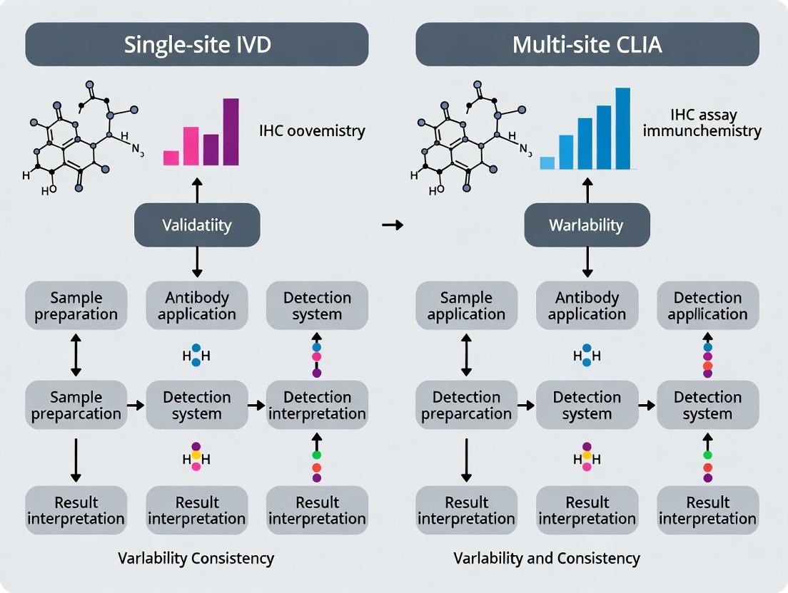 This comprehensive guide clarifies the critical distinctions between single-site In Vitro Diagnostic (IVD) and multi-site Clinical Laboratory Improvement Amendments (CLIA) validation pathways for immunohistochemistry (IHC) assays.